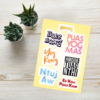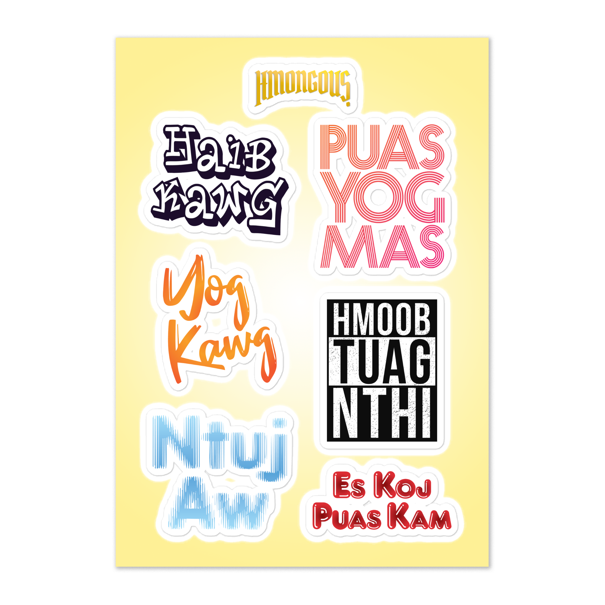 Decorate your belongings with these fun and colorful stickers! This sheet contains 6 different stickers, each one with a unique Hmong phrase. Made of durable vinyl, these stickers are perfect for laptops, water bottles, notebooks, and more.