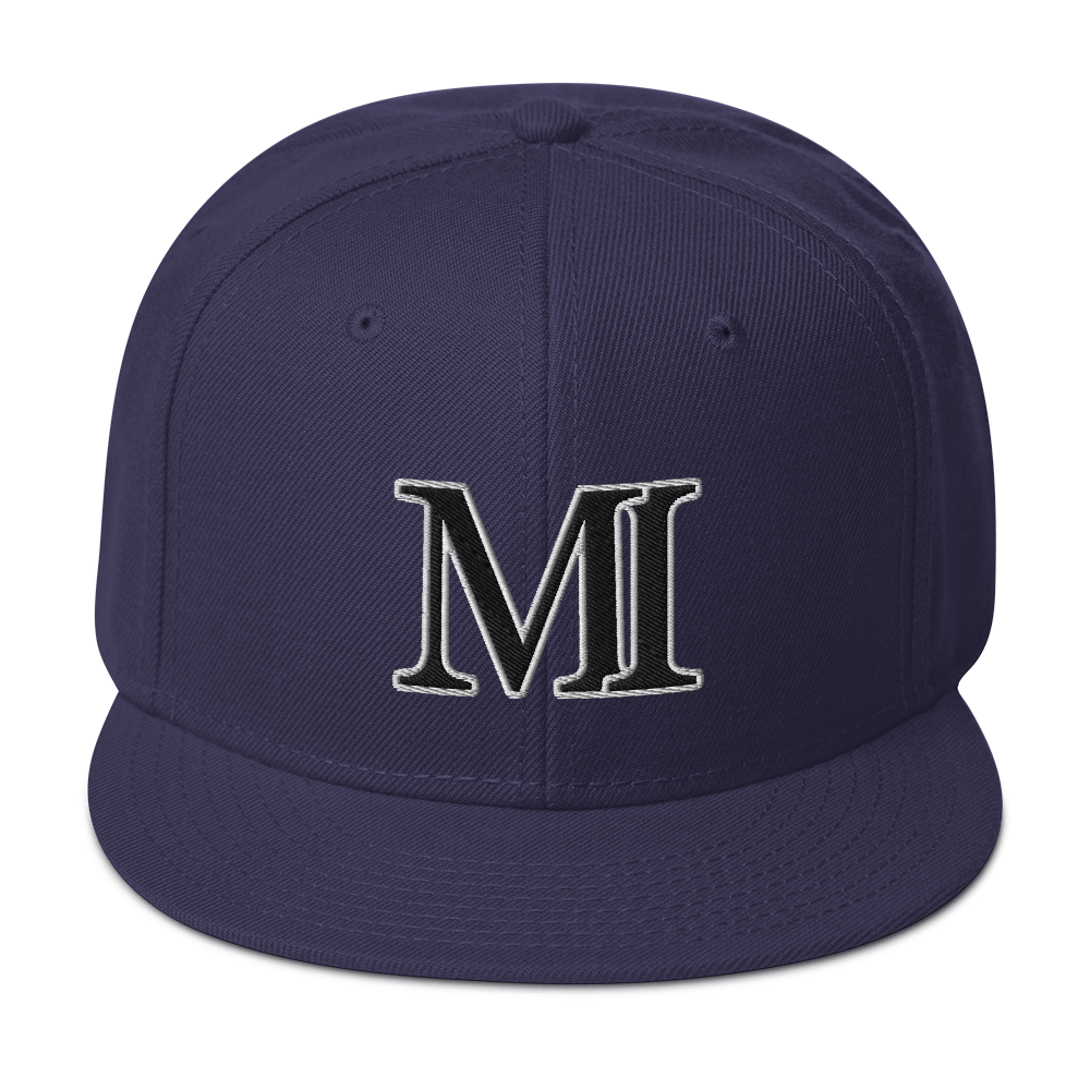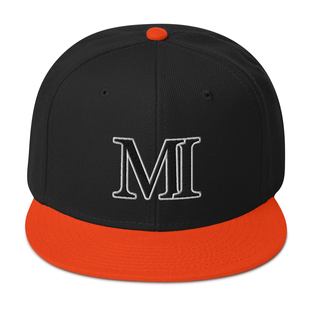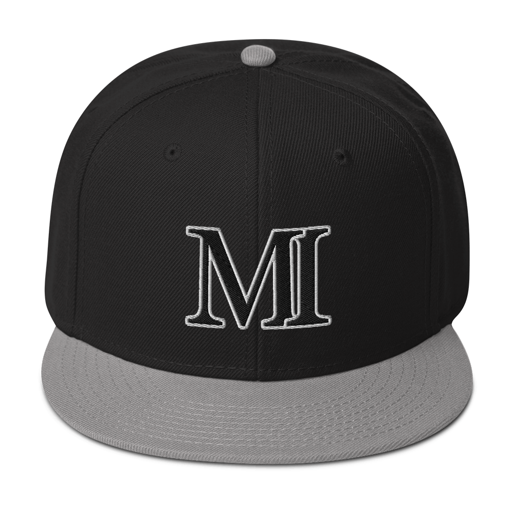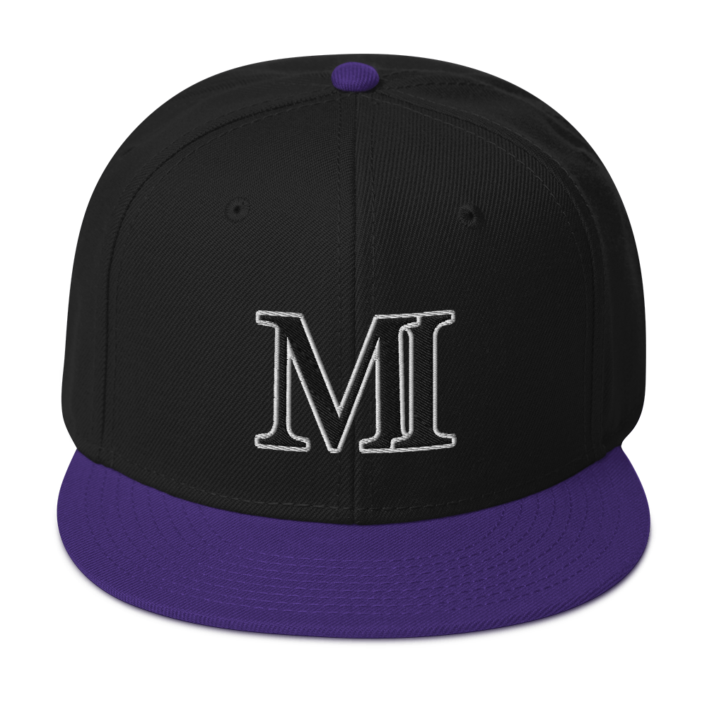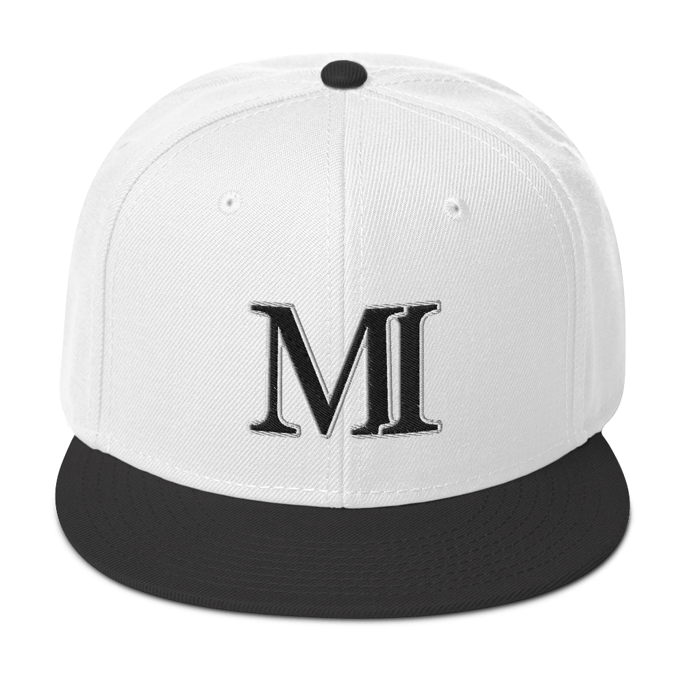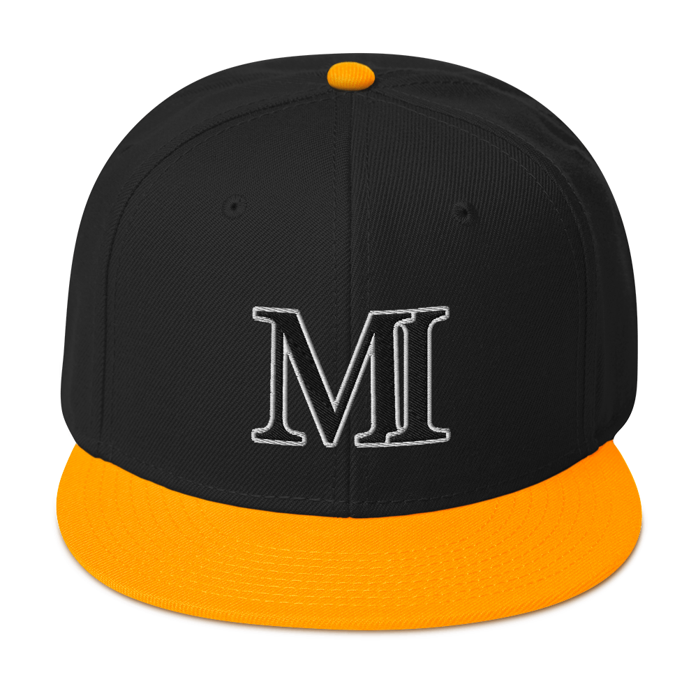 This snapback hat is perfect for any casual outfit. Embroidered with a black Michigan abbreviation, it is available in several different color schemes to match your style. It features a classic six-panel design with a flat brim that has a subtle gray color underneath and an adjustable strap in the back.