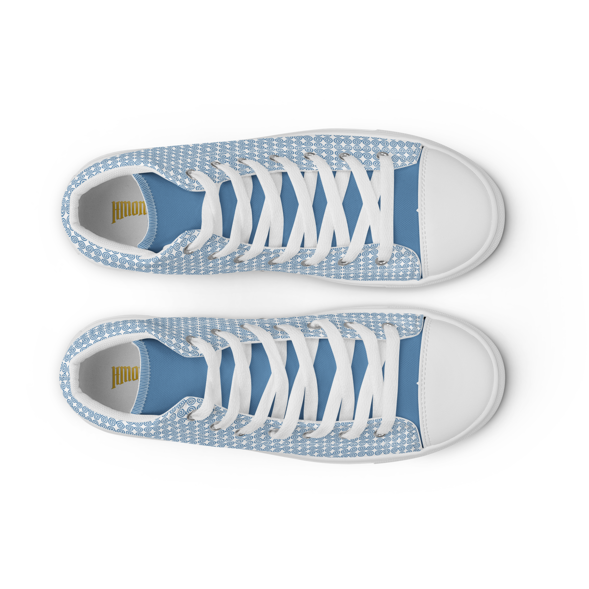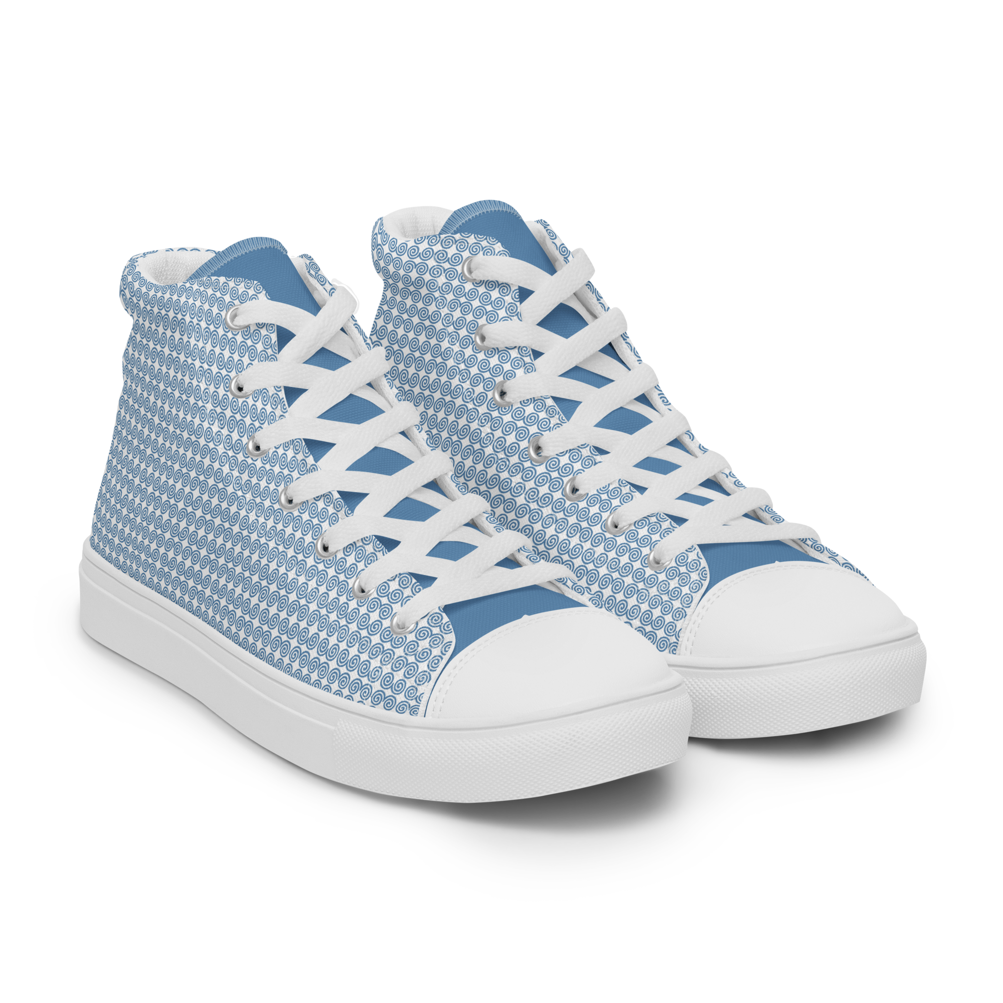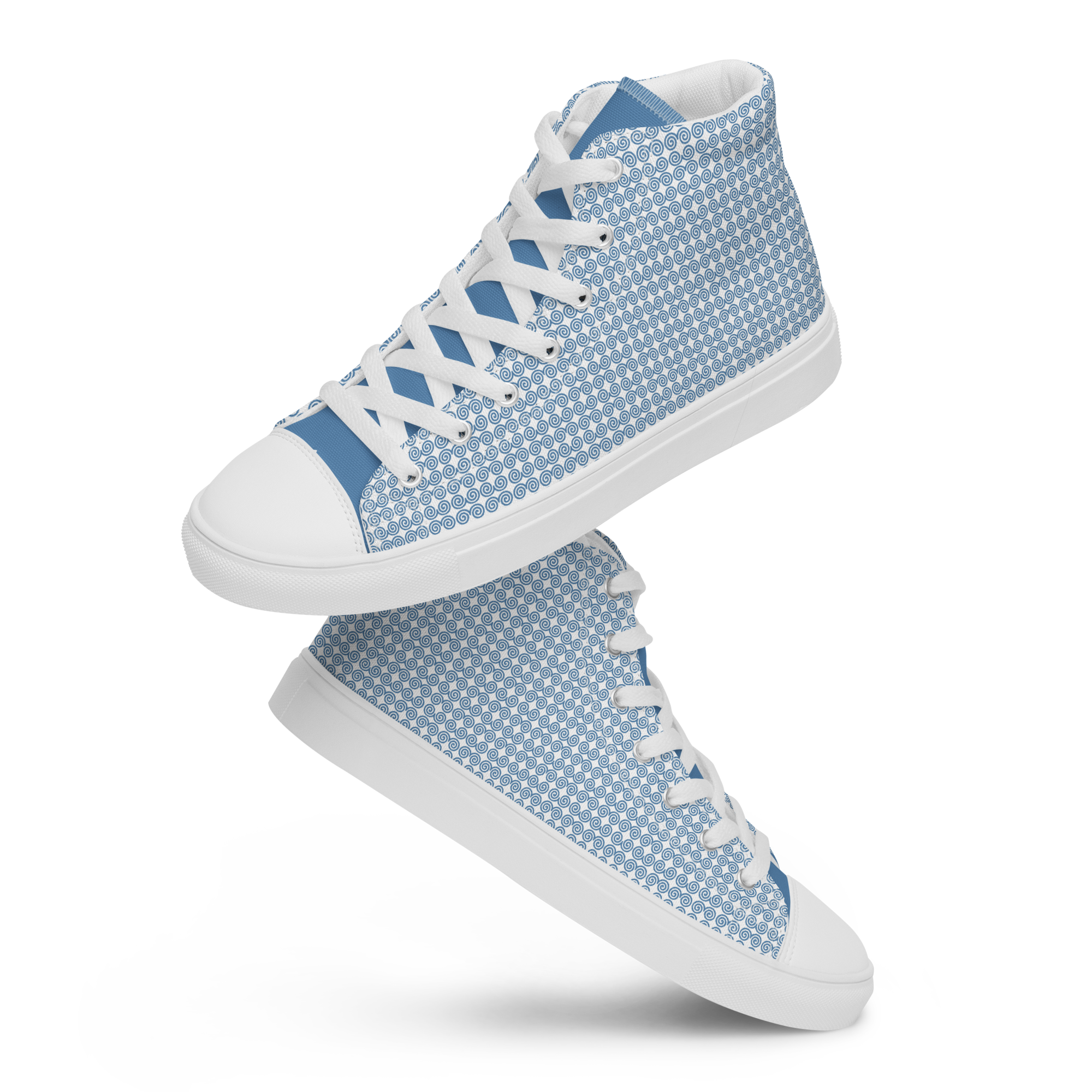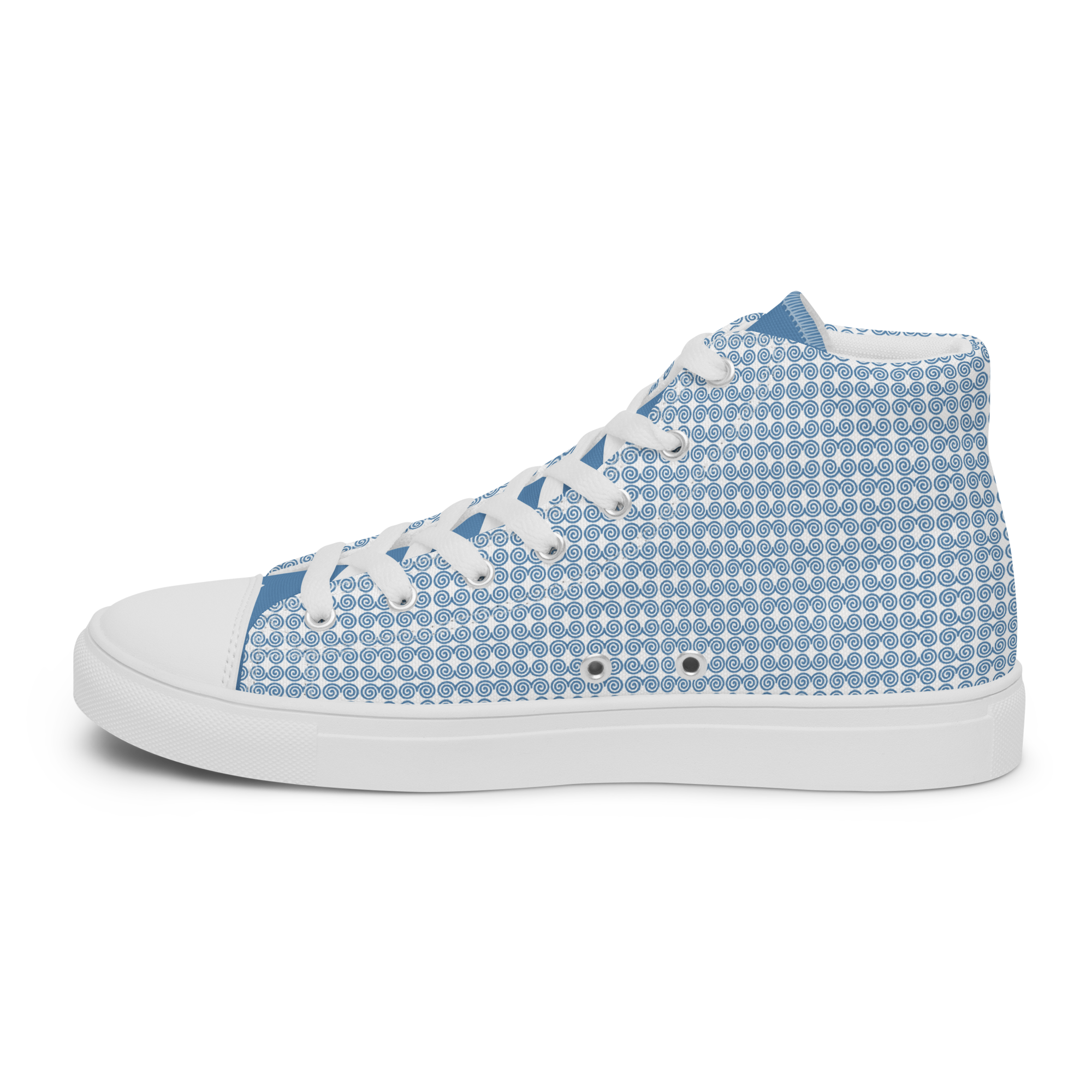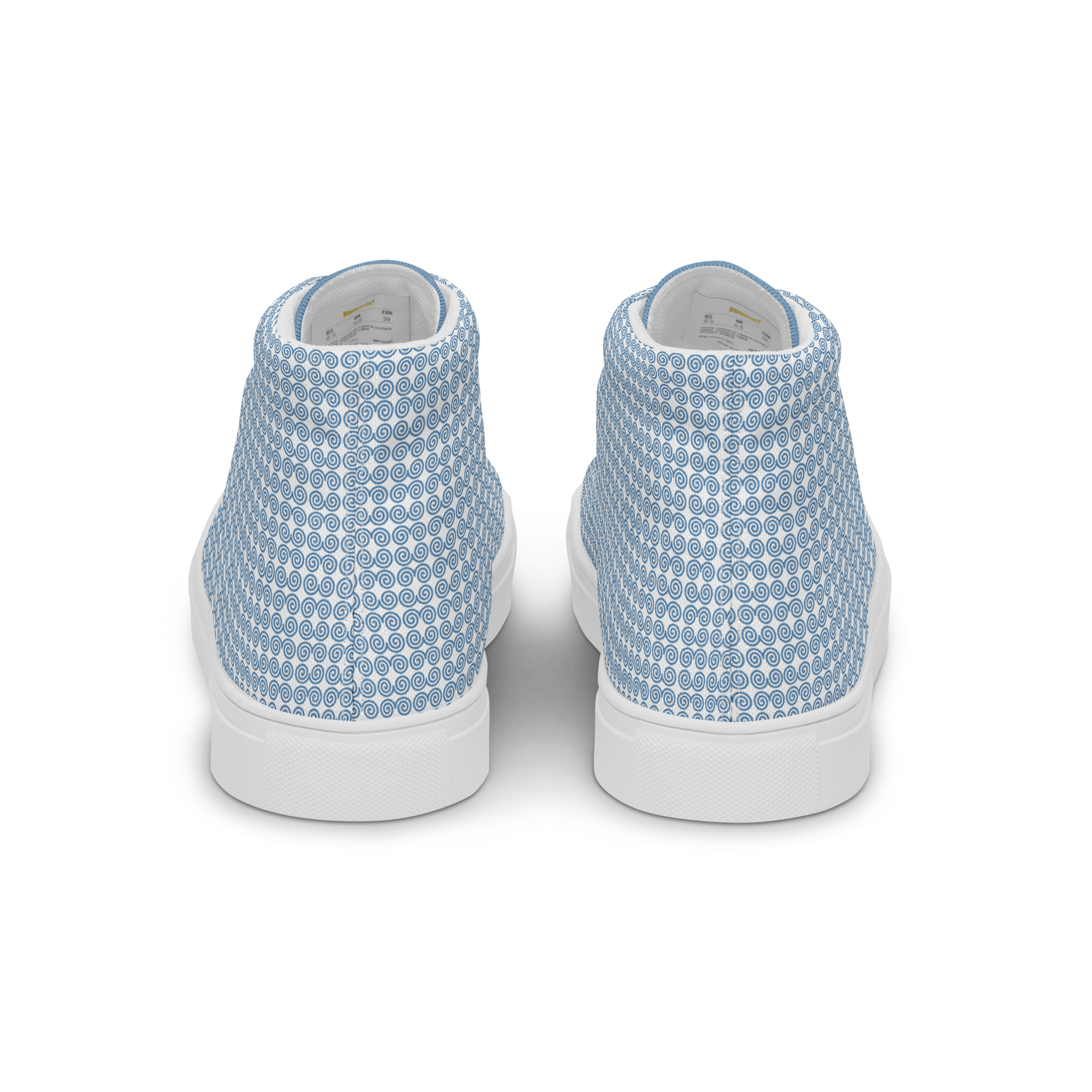 Step up your shoe game with the high top canvas shoes that are adorned with a blue Hmong snail motif design. These handmade, trendy shoes are sure to spice up your outfit. Get yours now!