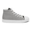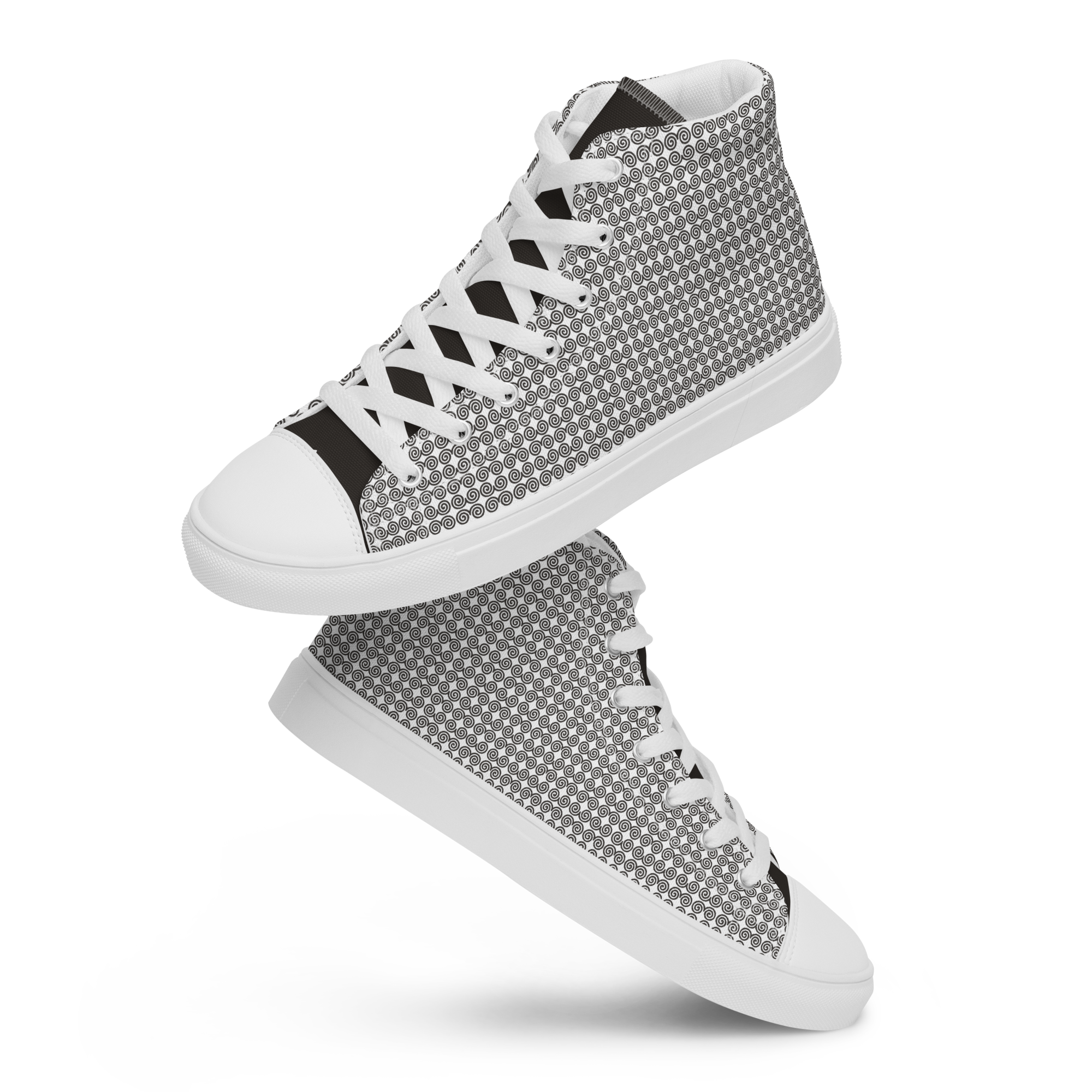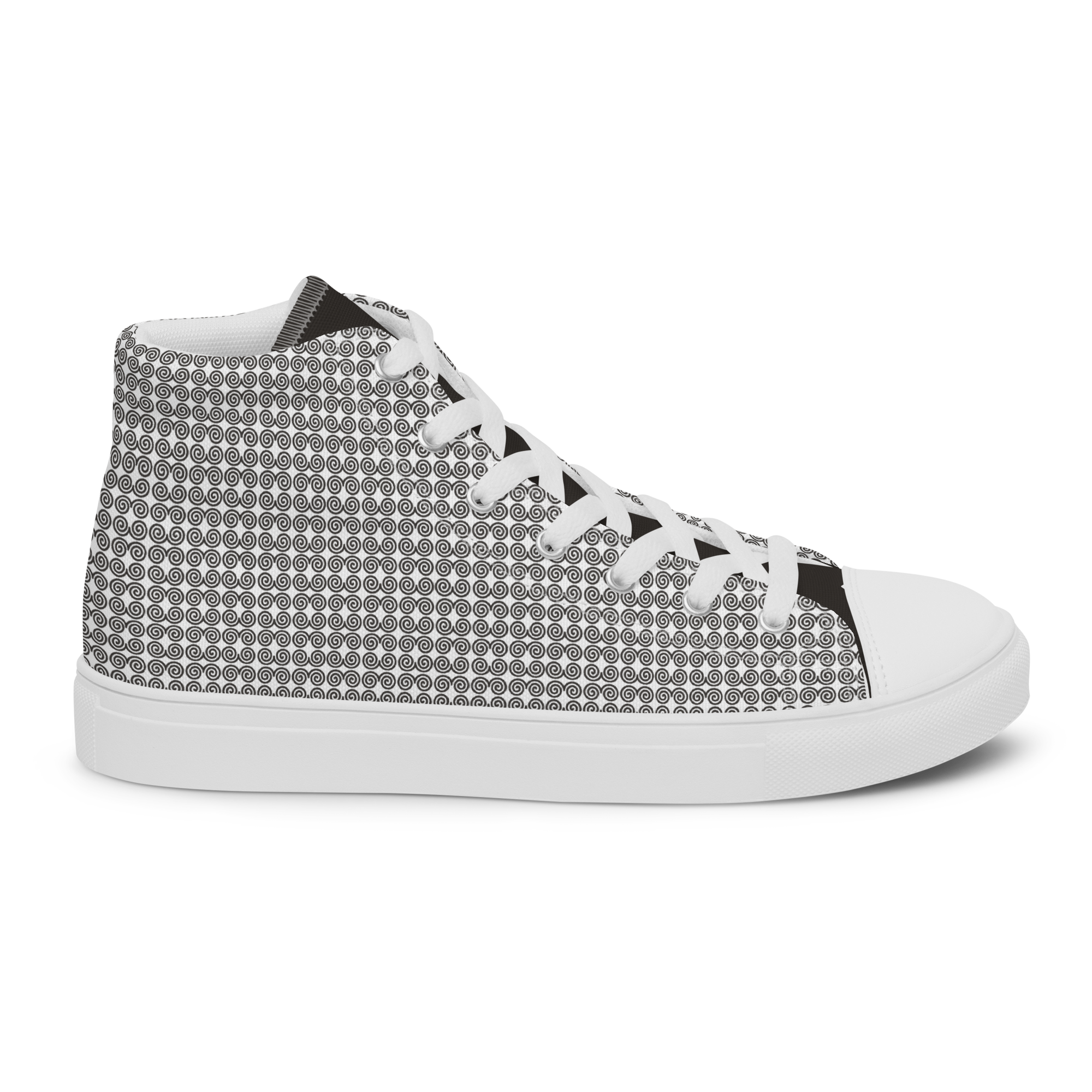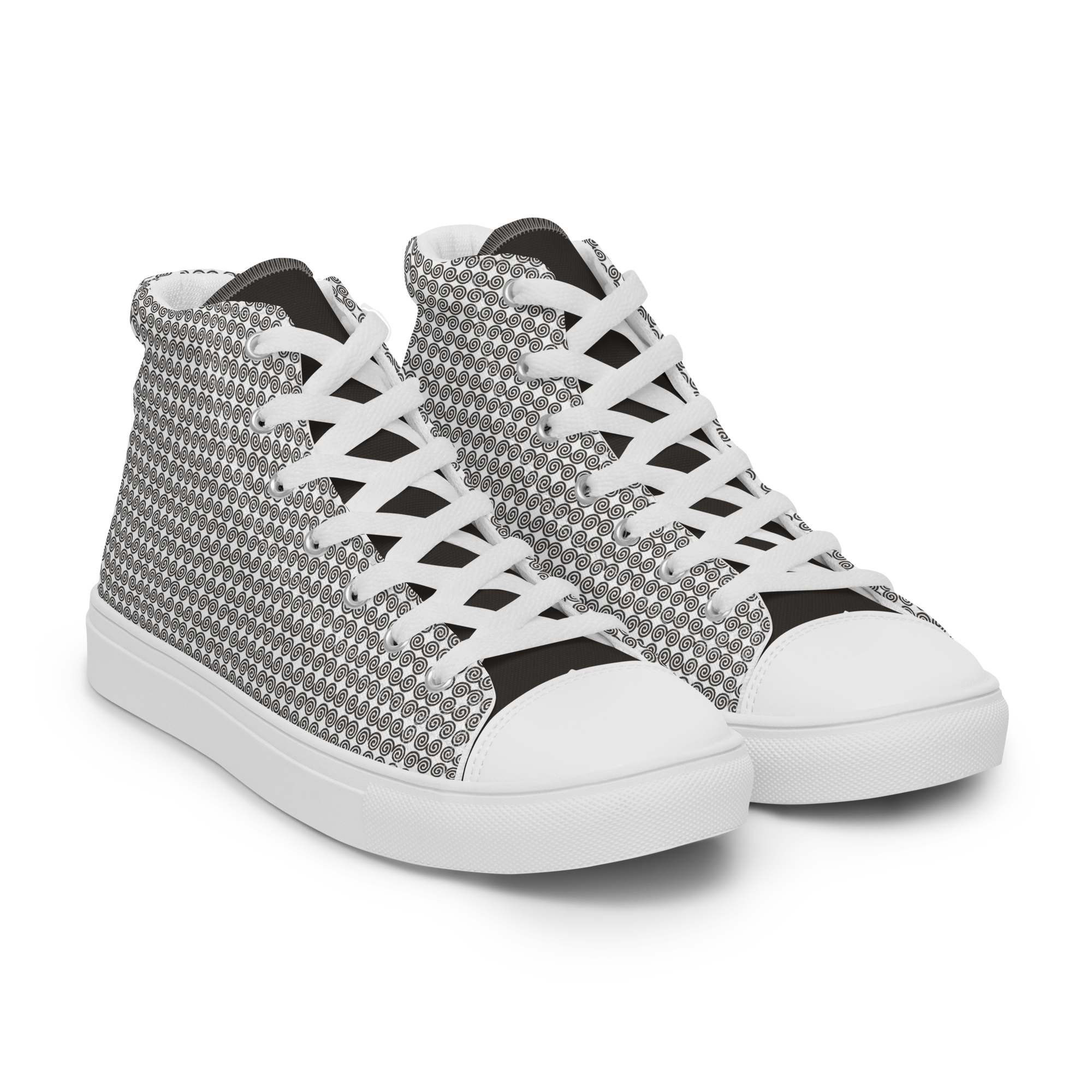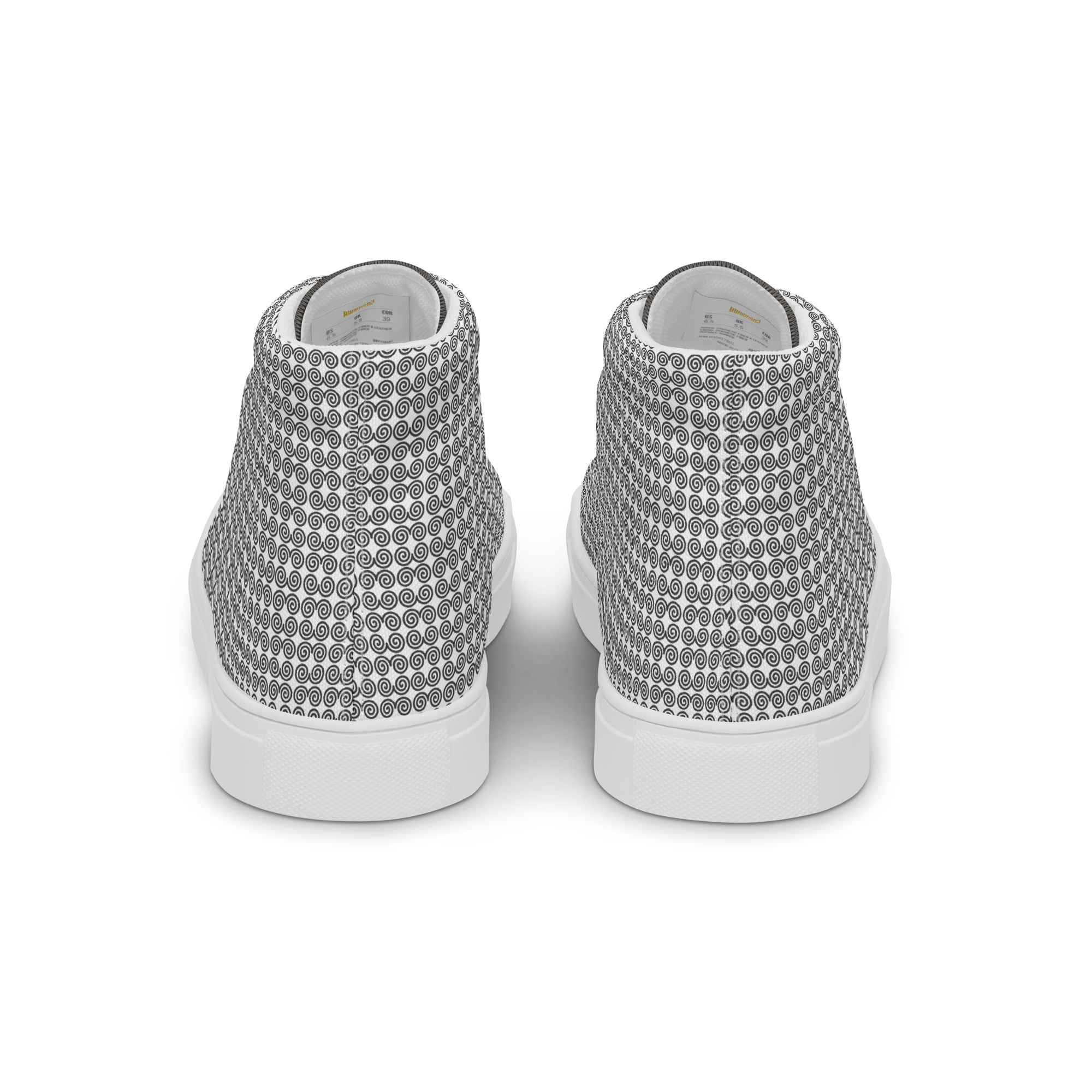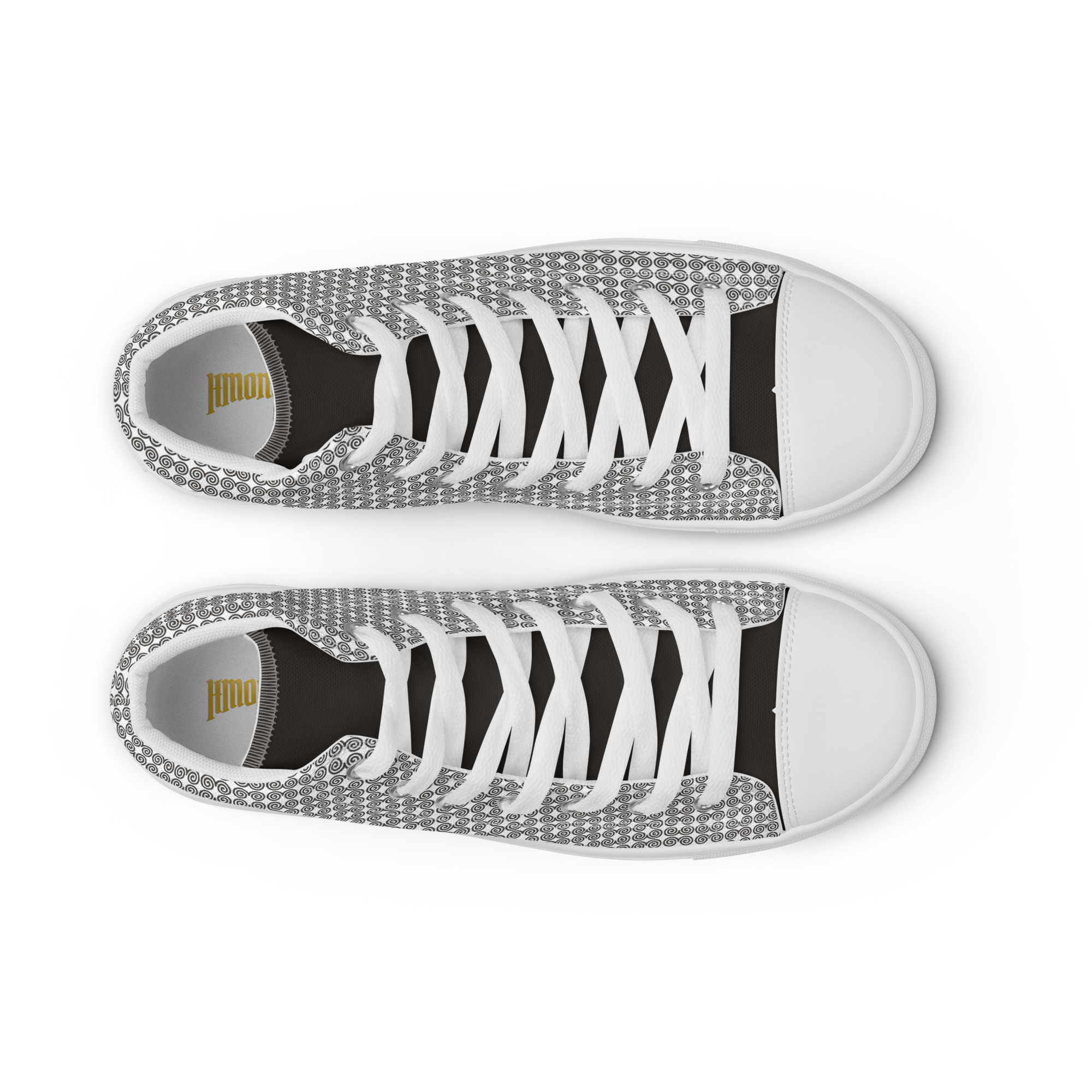 Step up your shoe game with the high top canvas shoes that are adorned with a gray Hmong snail motif design. These handmade, trendy shoes are sure to spice up your outfit. Get yours now!