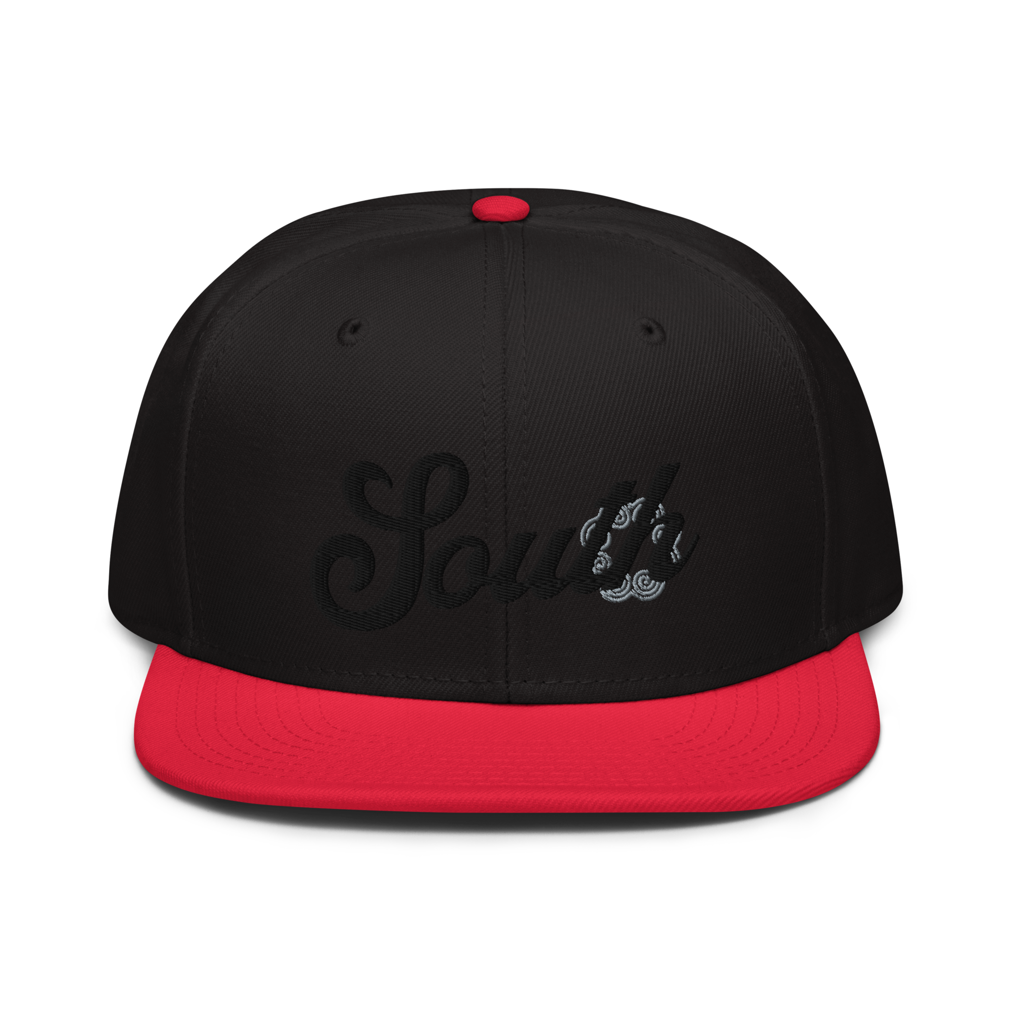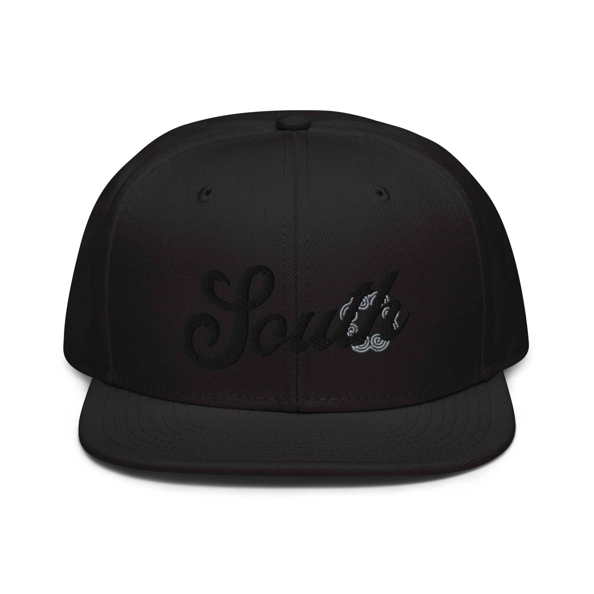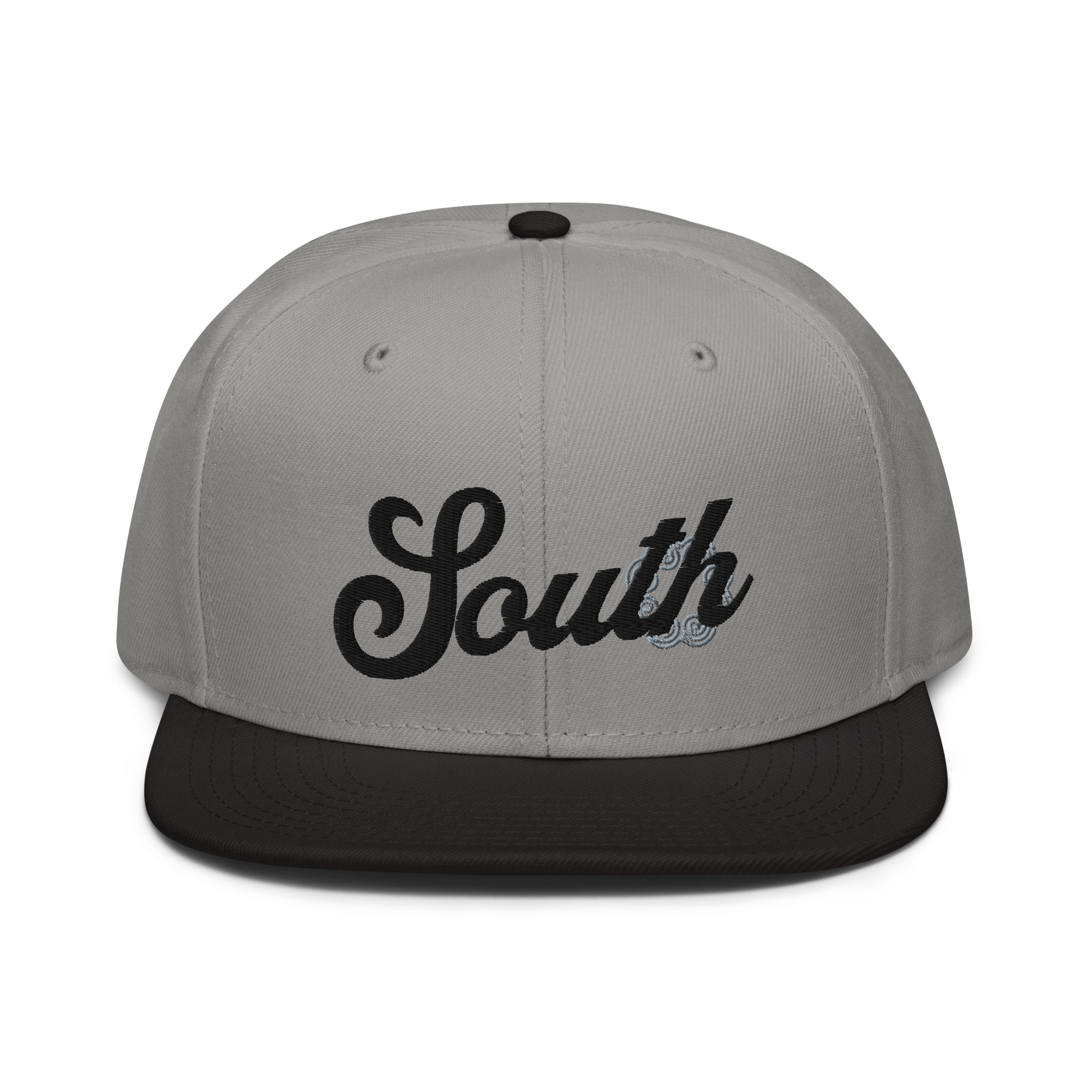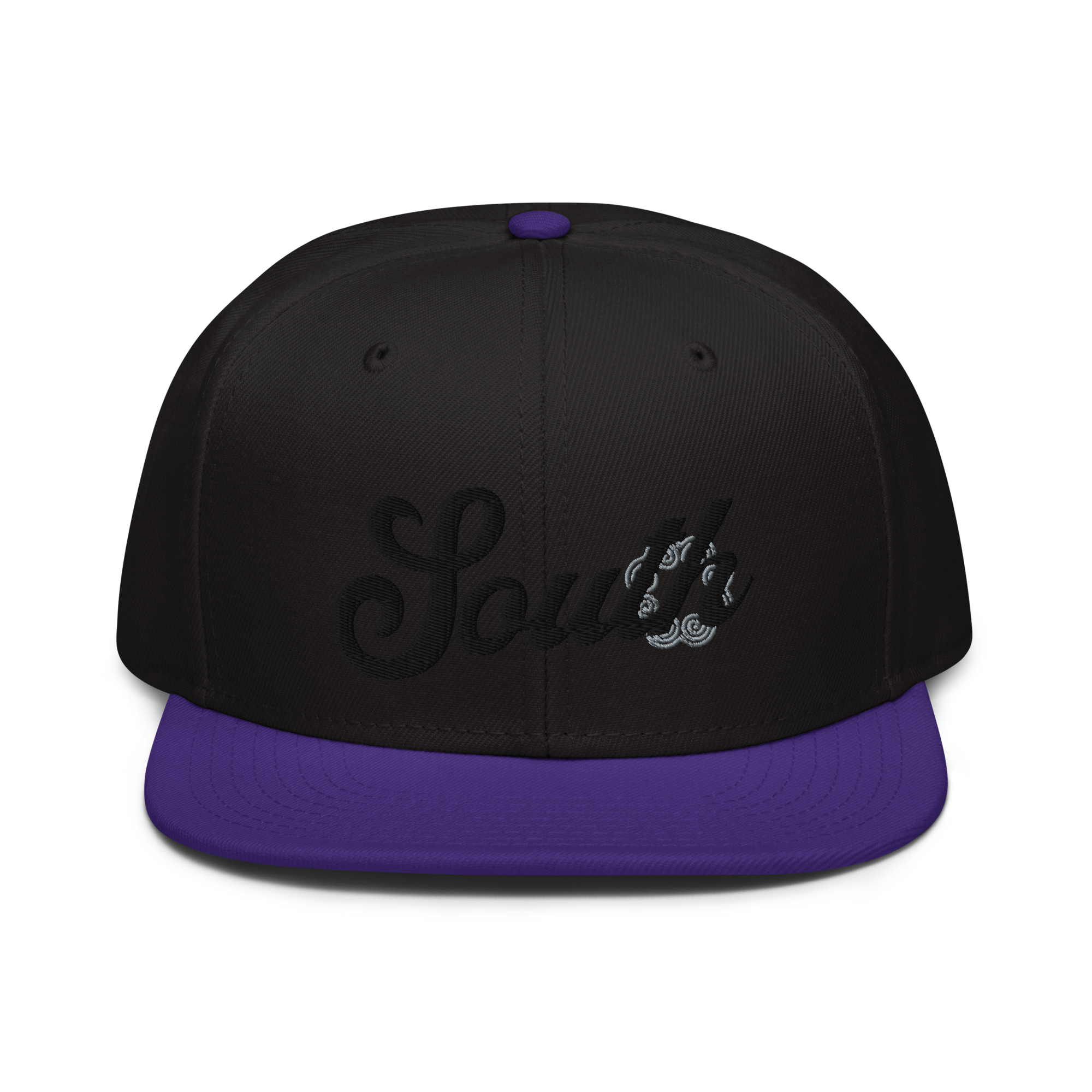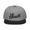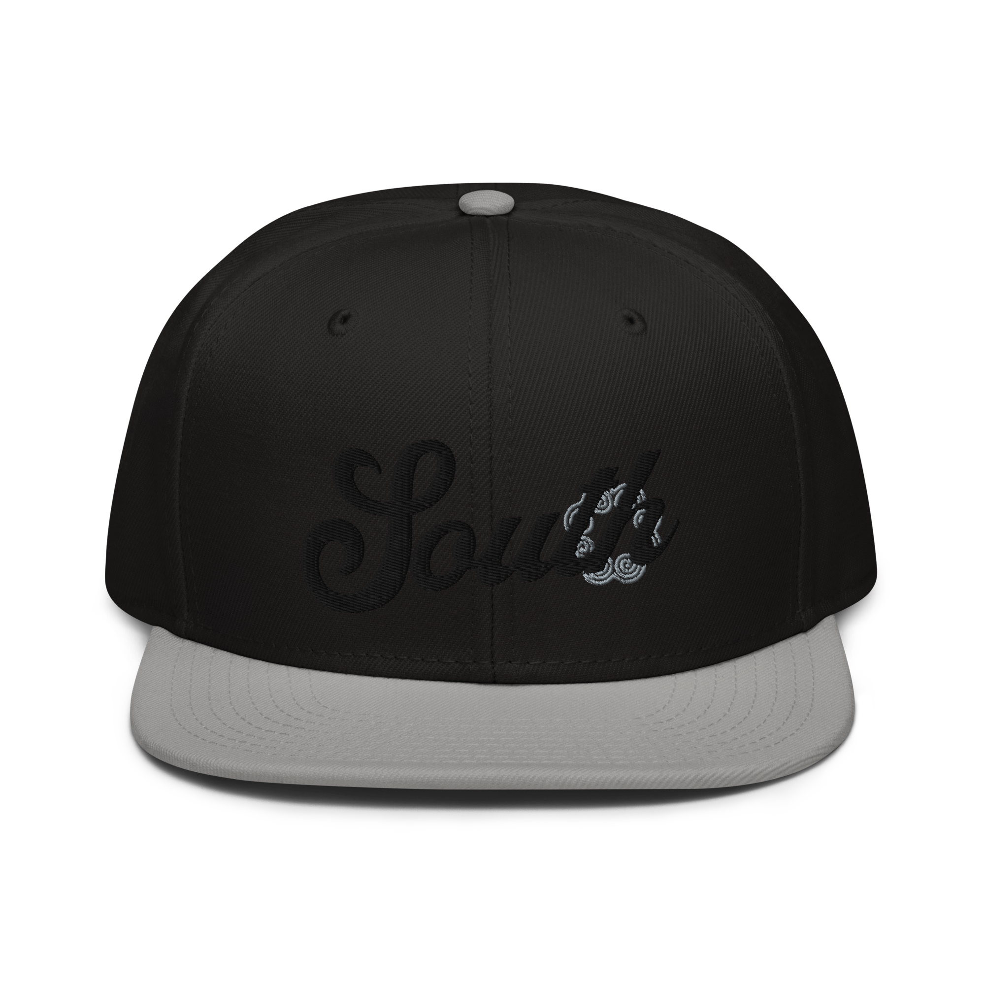 This snapback hat is perfect for any casual outfit. Adorned with a black South emblem against a gray Hmong elephant motif design that are embroidered, it is available in several different color schemes to match your style. It features a classic six-panel design with a flat brim that has a subtle gray color underneath and an adjustable strap in the back.