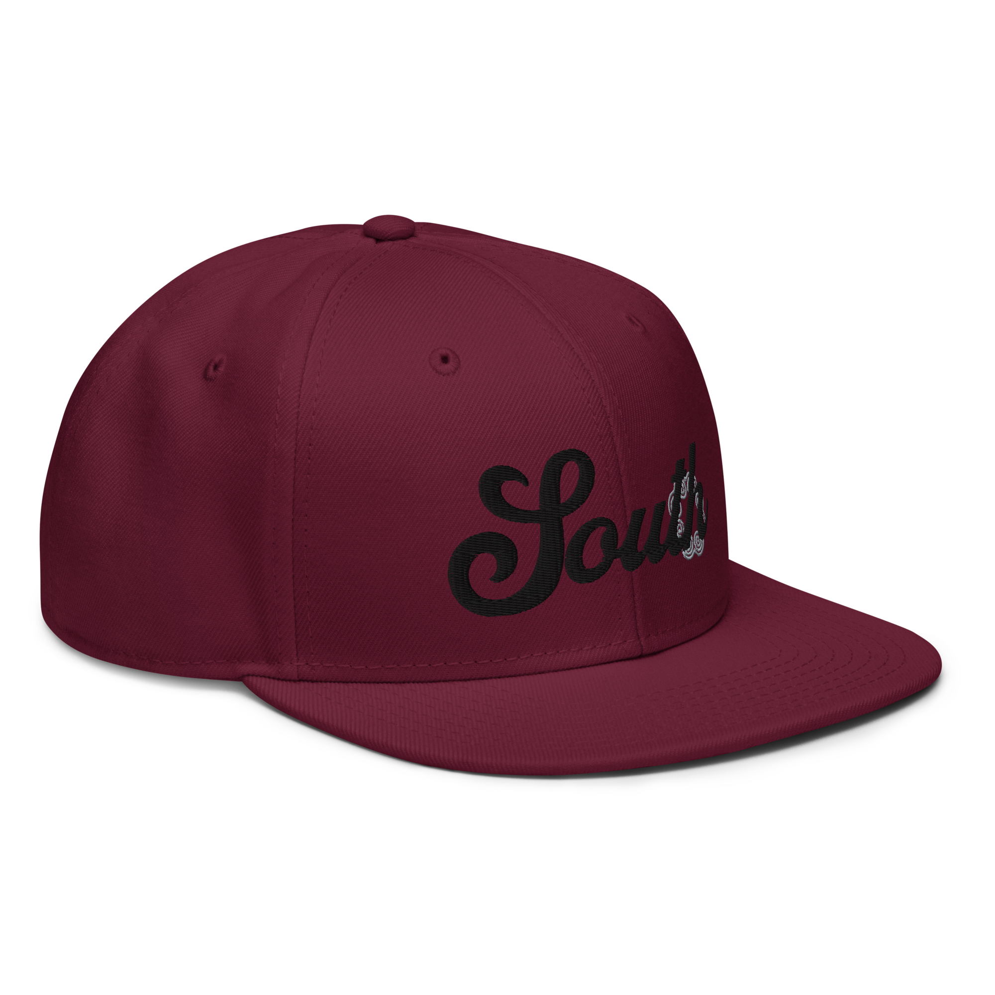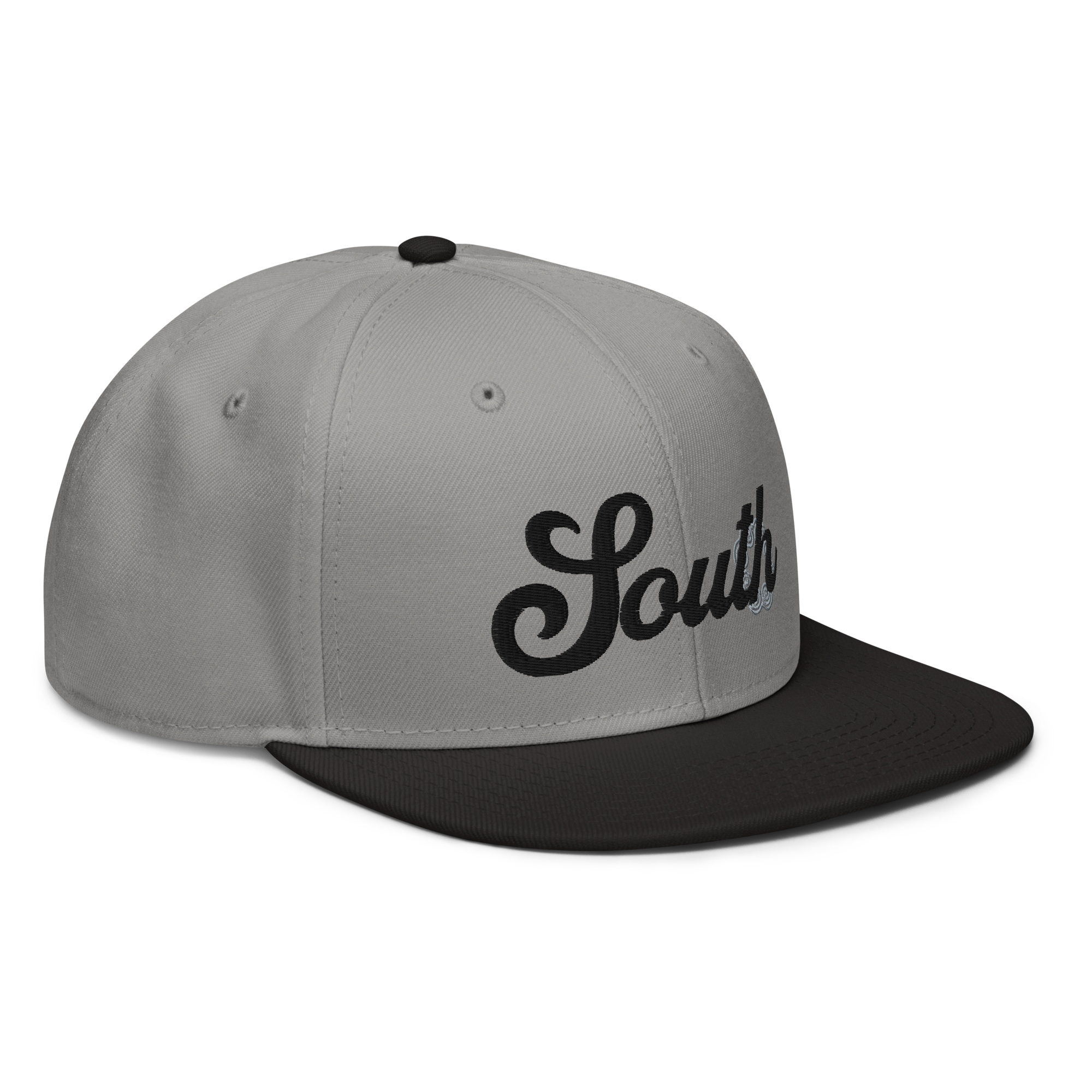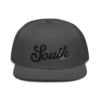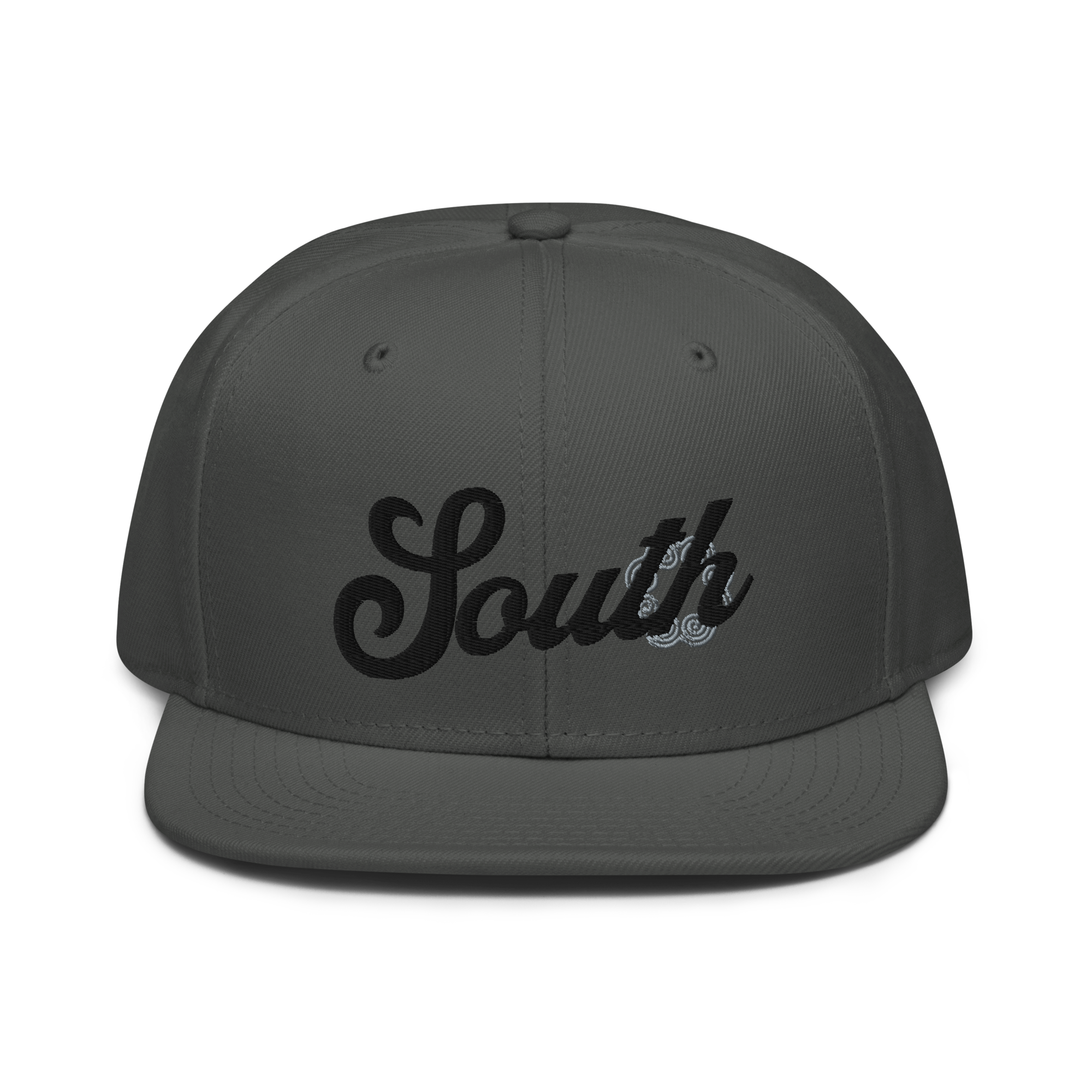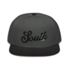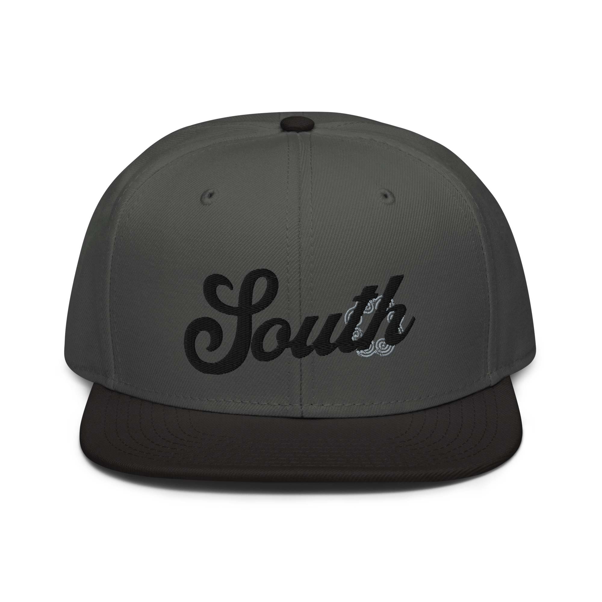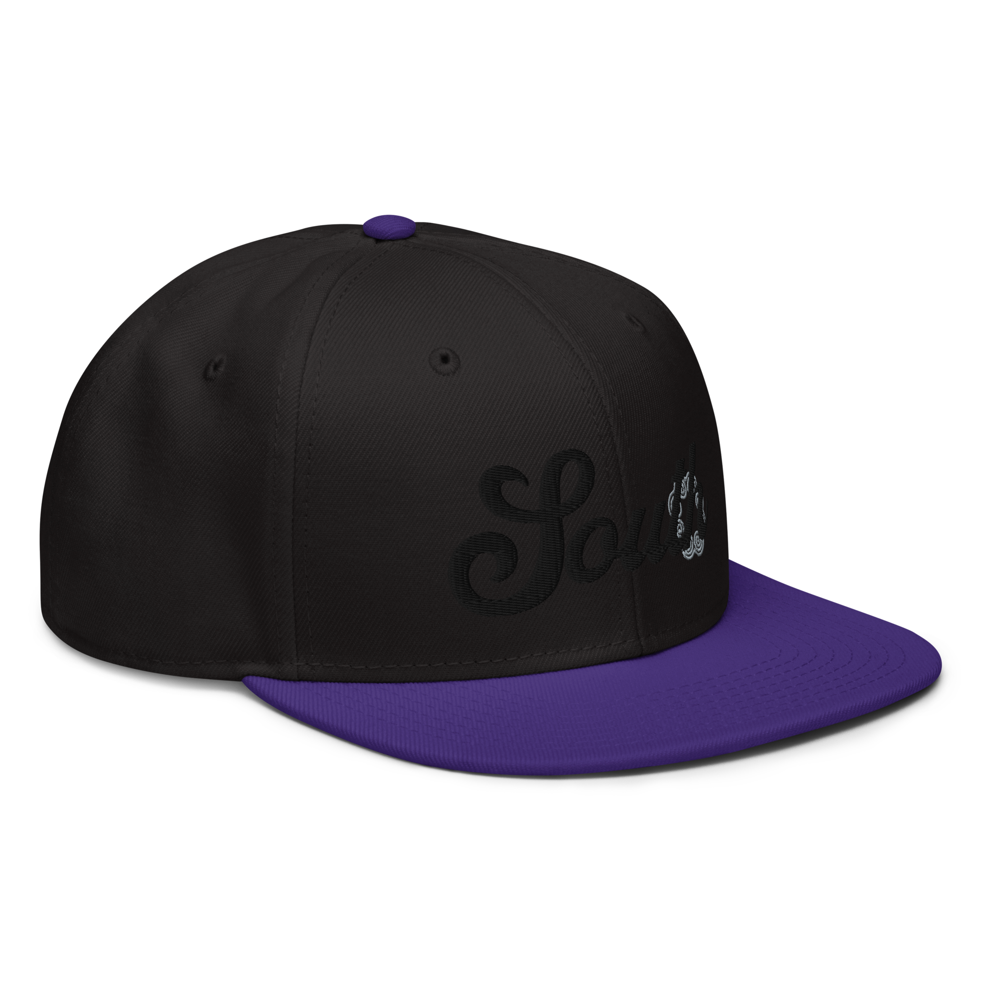 This snapback hat is perfect for any casual outfit. Adorned with a black South emblem against a gray Hmong elephant motif design that are embroidered, it is available in several different color schemes to match your style. It features a classic six-panel design with a flat brim that has a subtle gray color underneath and an adjustable strap in the back.